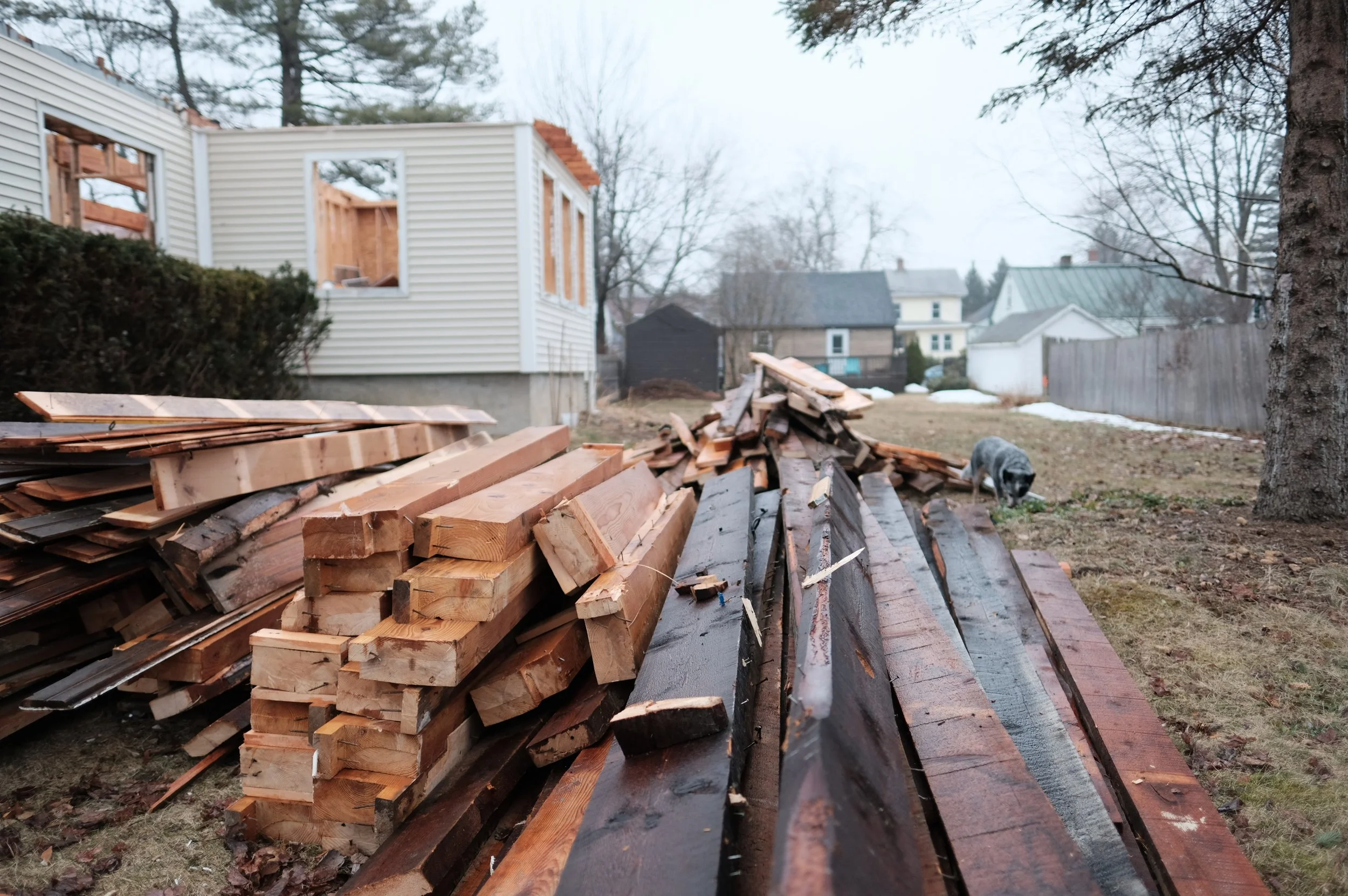 A professional deconstruction crew came up from Baltimore to take apart Din and Hambley's original home piece by piece. All usable materials were salvaged and sorted to be reused in other projects.