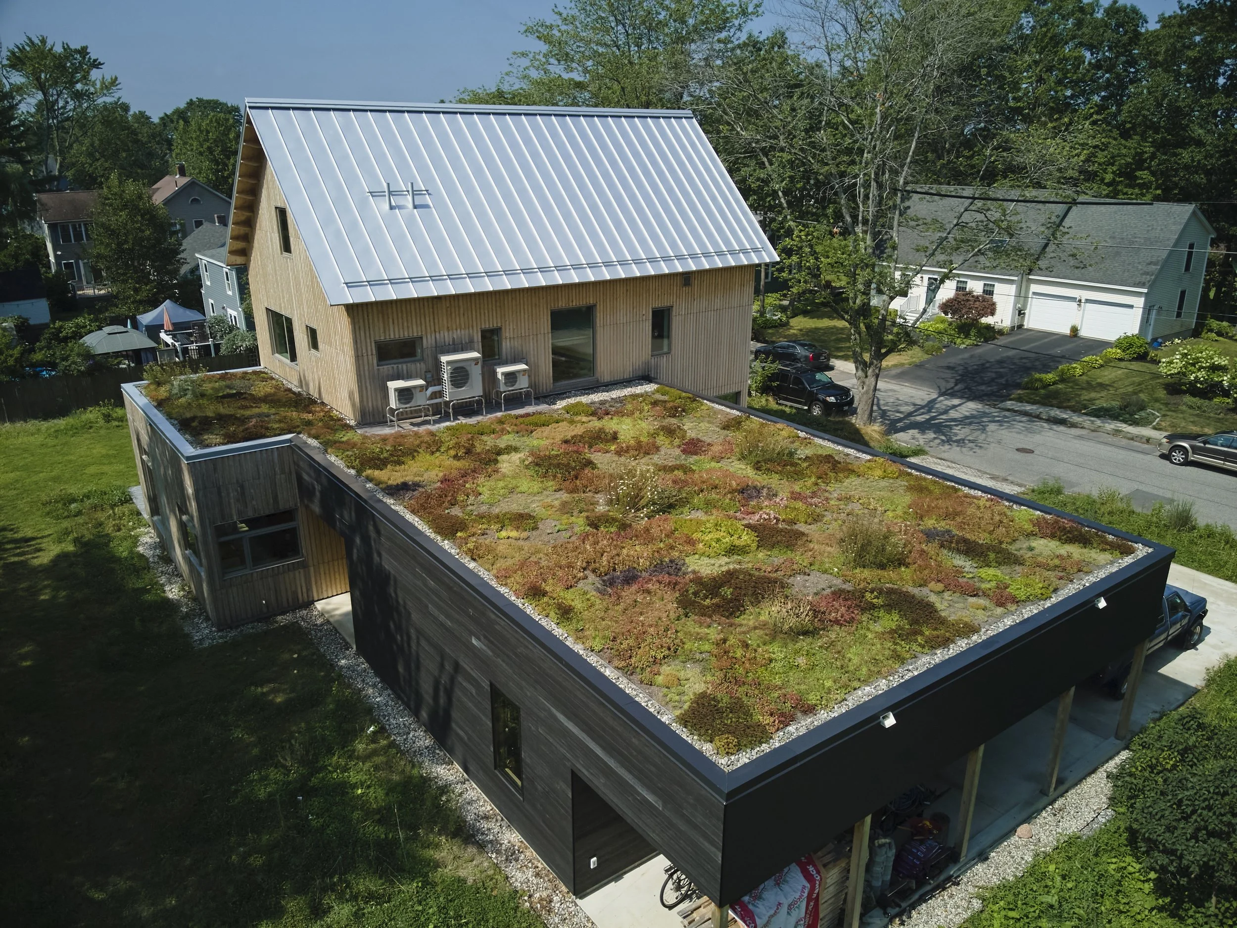 The result is a stunning, beautifully constructed and extremely practical home, outside and in. The unusually narrow and impeccably assembled board and batten siding was hand built to exacting calculations. The Northern White Cedar it’s made of comes from Maine and will develop a soft, silverygray patina over time; the same wood was also used for the framing, decking, and trim. In addition to a standing-seam metal roof that holds a solar array, there’s also a sedum-filled flat “green roof” that acts as a rainwater buffer, regulates indoor