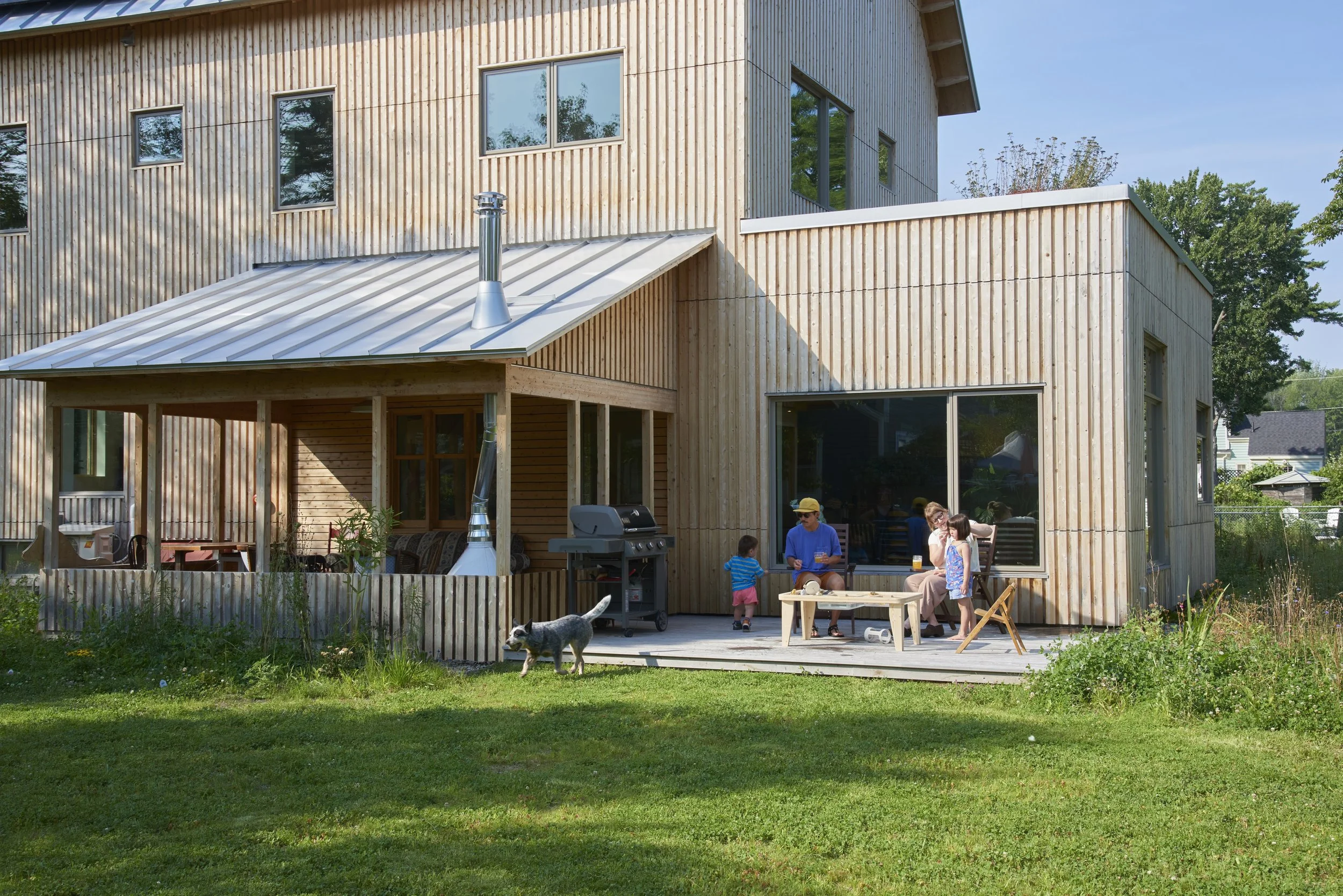temperatures, saves energy and encourages biodiversity. The covered porch is a dream come true for Hambley—and Sally and Whitney’s favorite part of the house. The homeowners preferred a meadowlike garden over a lawn, and the children were happy to help with the landscaping by planting clover and native plants grown from seeds they found on walks with their parents all over town. Among them are “lots of goldenrod and curly dock because those seeds are so much fun to gather,” Hambley says.