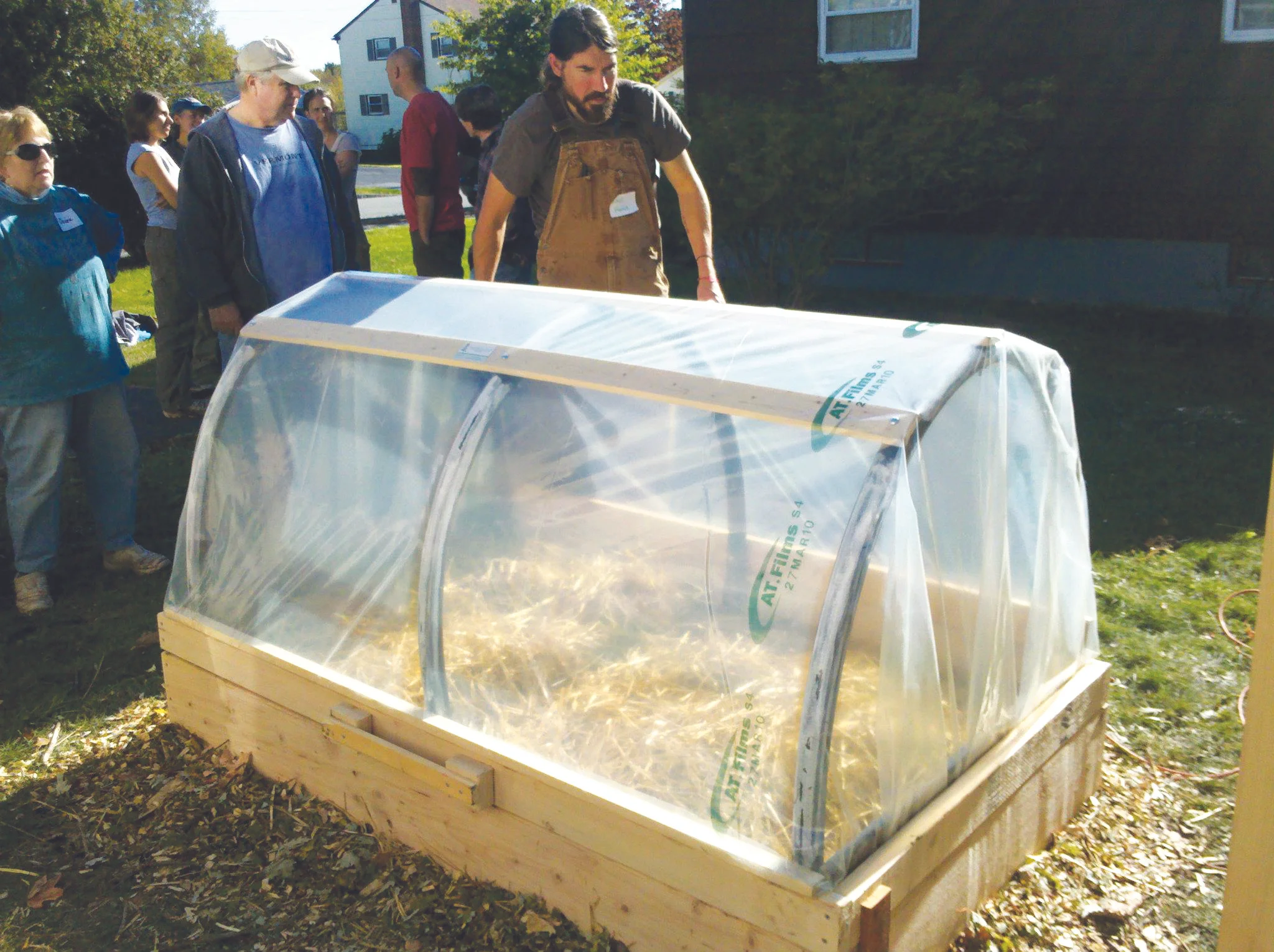 David Homa, of Post Carbon Designs, demonstrates his signature hinged hoophouse which has more ground clearance than other standard cold frame designs, leaving more room for higher-growing crops or a second layer of coverage, such as straw or Reemay. Photo courtesy of Post Carbon Designs