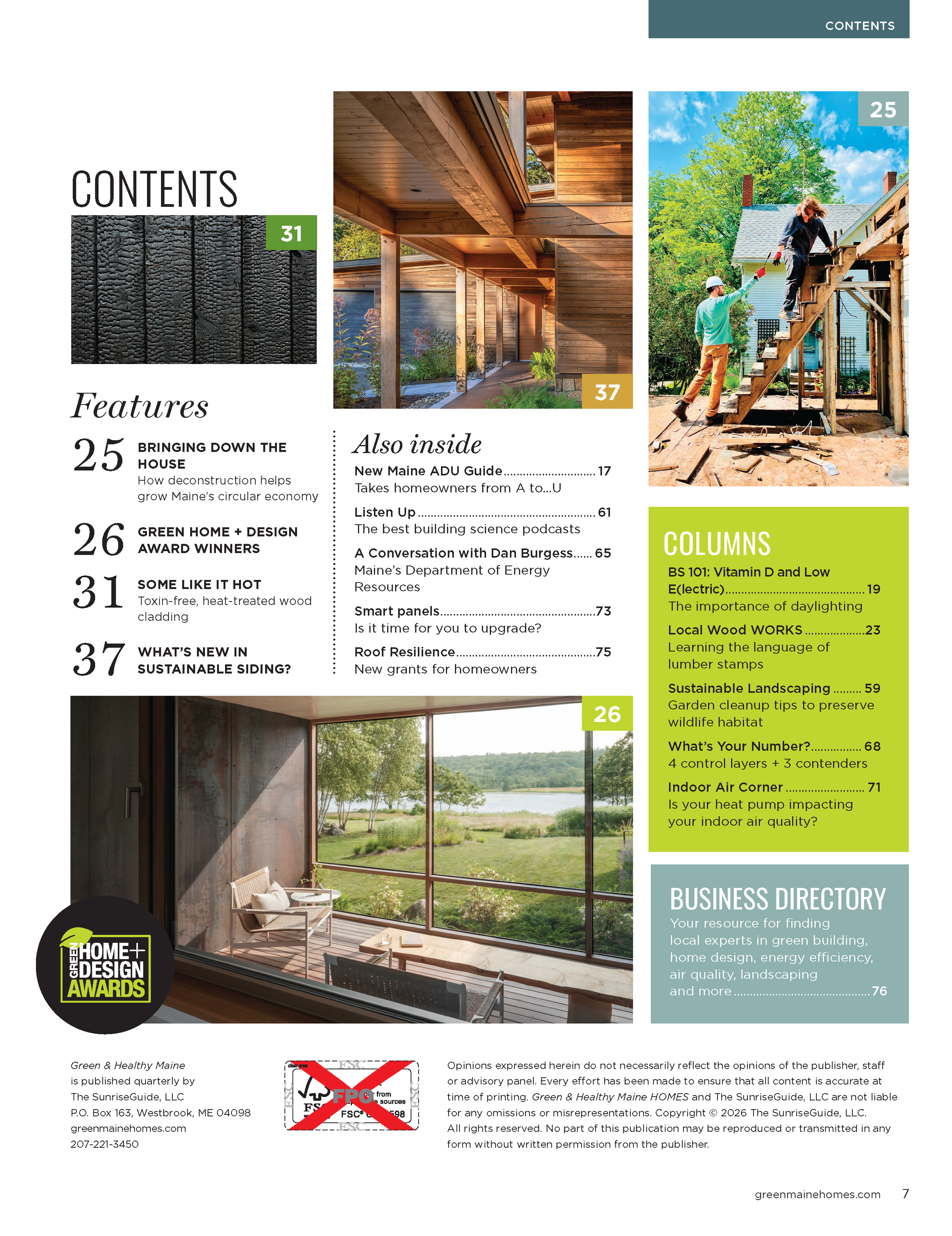 Inside, you'll find expert advice, informative interviews, profiles of high performing Maine homes, and information about cutting-edge technologies for making Maine homes healthy, comfortable, efficient and sustainable